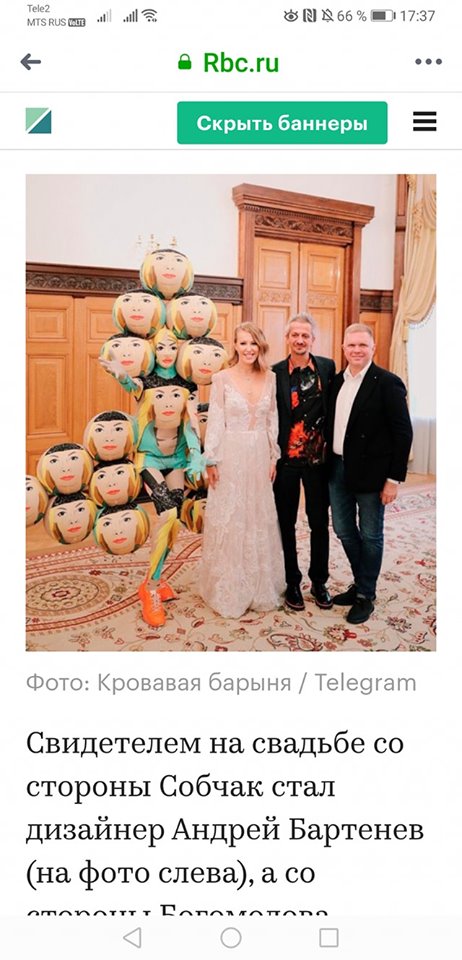 Автомобиль был обит красной тканью, а сверху на крыше по указанию Ксении и Константина было размещено два золотых кольца. Надпись на крыле мало подходящего для обряда бракосочетания автомобиля украшала надпись:«Пока смерть не разлучит нас». (Отсюда.)
