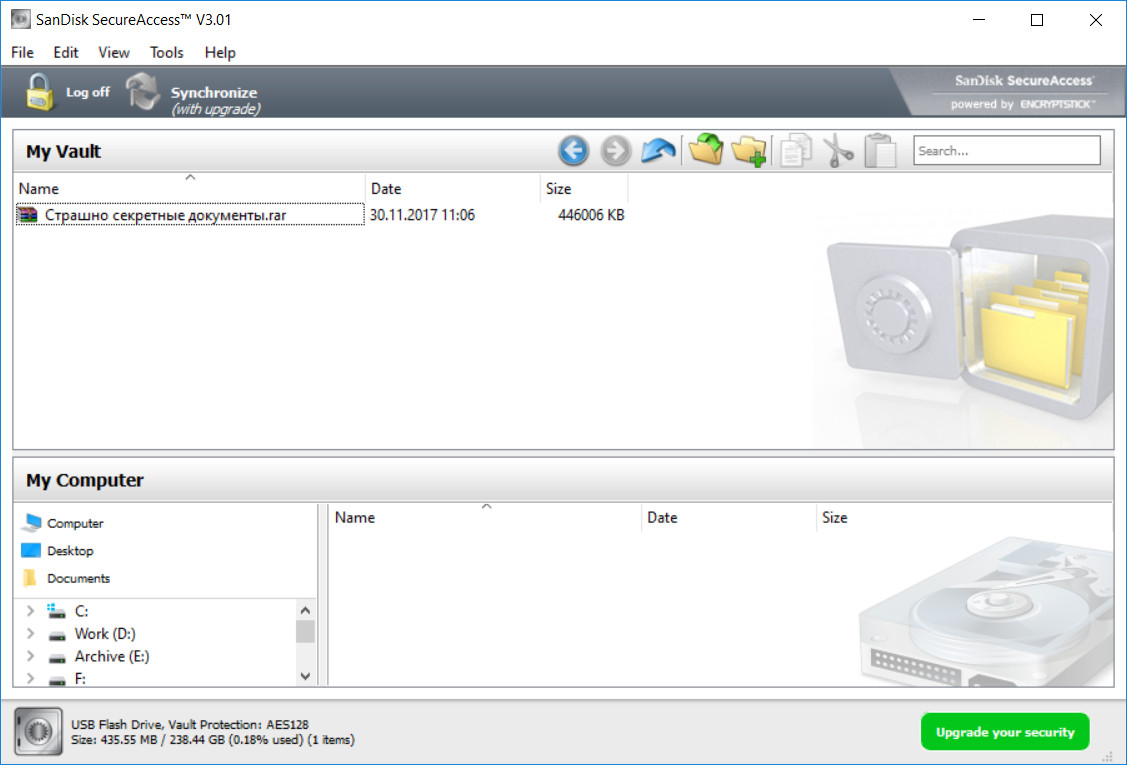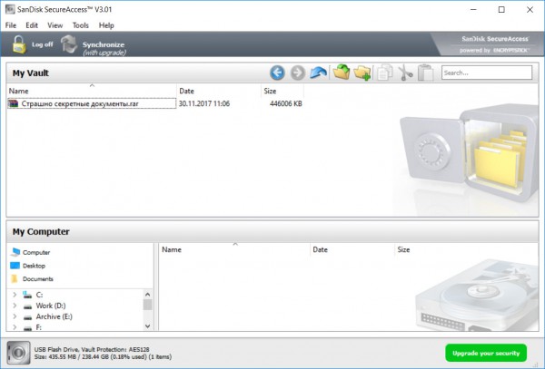 Также на этих флешках содержится специальный софт для защищенного хранения данных. Задаете логин-пароль, в сейф перемещается нужные вам данные - они хранятся на флешке в защищенном виде. Тоже, в общем, вполне полезно.