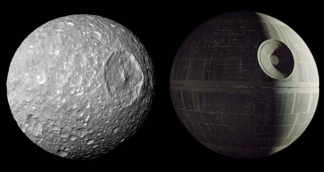 Вот куда более удивительная фотография, пусть черно-белая. Тоже спутник, но это Мимас. Фото сделано миссией Кассини.