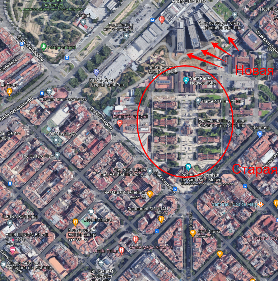 кстати, старая больница, как хорошо видно на спутниковом снимке, специально ориентирована запад-восток, против планировки Eixample, и представляет собой big fuck-you от Мунтанера (архитектора больницы) => Серде (инженеру, который придумал и реализовал план Exiample).