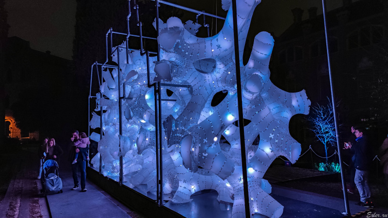 Каждый год перед Рождеством в Сан-Пау устраивают специальные световые инсталляции. Мы первый раз туда сходили в прошлом году, очень понравилось, в этом году тоже поехали посмотреть. Оказалось, что там была уже совершенно другая инсталляция, не такая, как в прошлом году. (Кстати, просто так с улицы туда не попадешь: посетителей запускают группами по времени, билеты нужно заранее покупать через Интернет.)