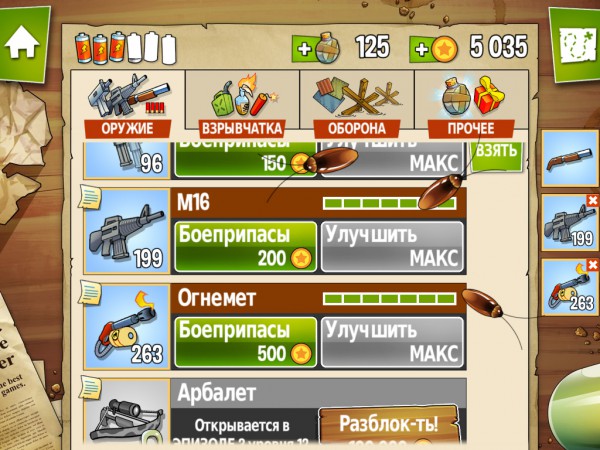 Однако должен заметить, что создатели игрушки достигли каких-то невероятных высот в плане выманивания денег у клиентов. Ладно еще, когда приходится покупать груду монеток, потому что тех, что выдают - явно недостаточно. Но эти гады еще сделали ограничение по времени игры: сверху слева 6 батарей, которые "разряжаются". Когда все разрядятся - игрушка блокируется на время. Но разблокировать, как вы понимаете, можно - за деньги. Также за деньги можно разблокировать любые предметы и оружие, которые выдаются за прогресс в игре. Любой предмет и оружие можно улучшать - за деньги.
