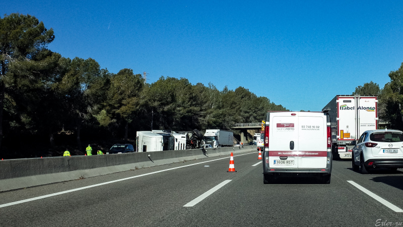 Кстати, по дороге вот такое происшествие заснял. Здоровенный трейлер упал на бок, передний мост у него разворотило отбойником. Пробку собрал нехилую - три ряда слились в один, у нашего направления тоже один ряд заняли под технические работы, тоже пробка была, но небольшая, всего на 15 минут.