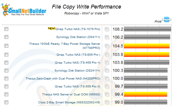Кинули ссылочку на очень интересный набор тестовых табличек различных NAS. Там можно фильтровать по различным производителям, выбирать различные виды тестирования - просто запсь/чтение, запись чтение на RAID1,5,10, бекапирование с NAS на устройства USB и обратно, ну и так далее. Вообще очень показательно.