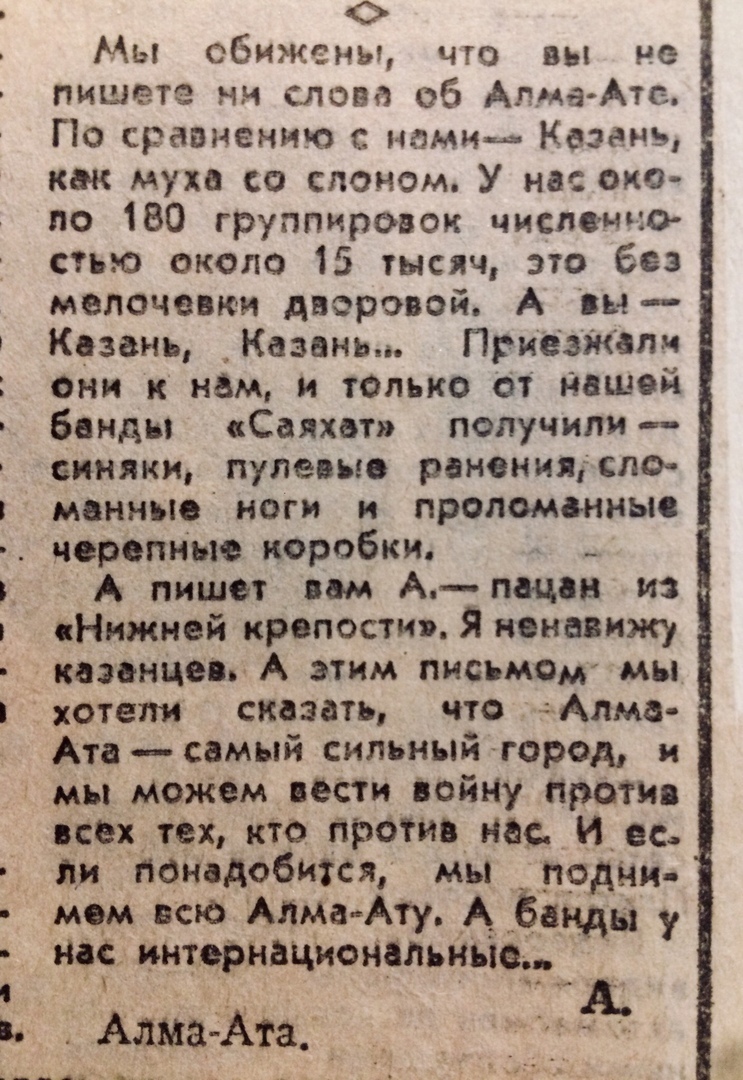 Чё-то тригернуло. Я, правда родившись в Барнауле, уехал оттуда в 81-ом учиться в Новосиб. Но ни там ни там ни в каких "битвах" не учавствовал. И даже про них не слышал. Не скажу, что значит "их не было", но однозначно быть упомянутыми спустя 40 лет в инете они не заслуживают. Так, местечковые разборки, не чета "казанскому феномену".