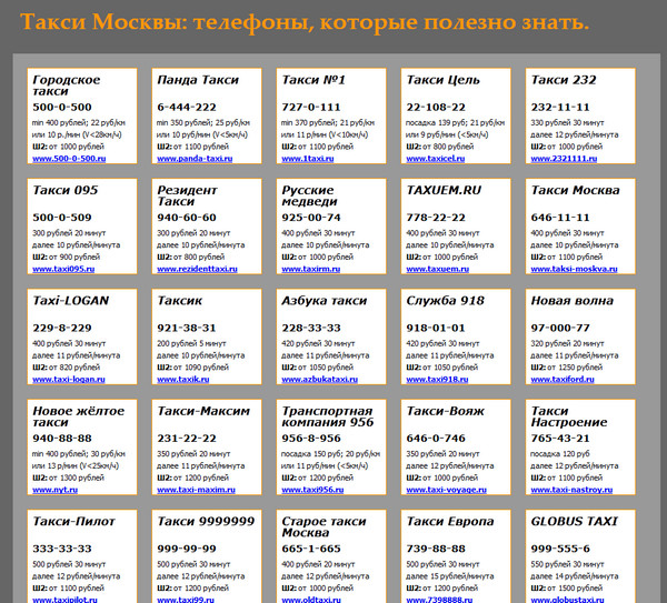 Полезная страничка - "Такси Москвы". Полезность в том, что службы размещены в порядке возрастания стоимости. Как правило, более высокая стоимость означает более высокое качество. Хотя, как у нас бывает, и не всегда.