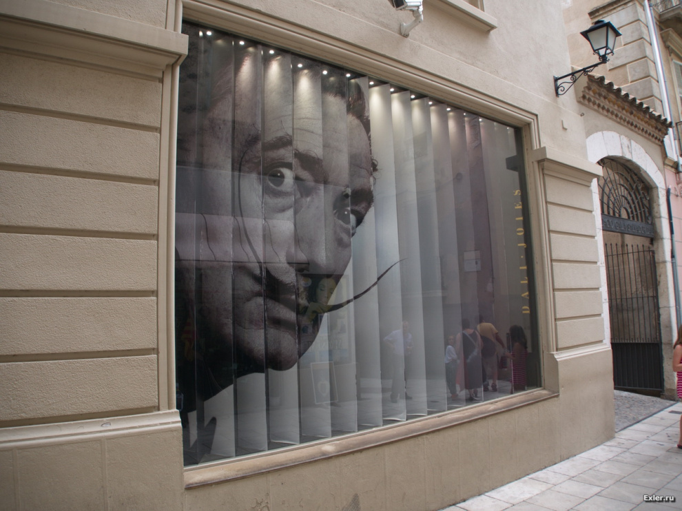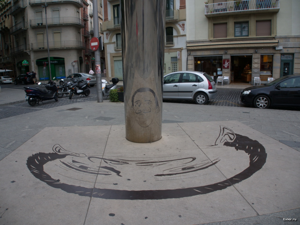 Мы оставили машину на парковке и отправились к музею. Изображения Дали тут действительно на каждом шагу: вот, например, забавная оптическая инсталляция - голова Дали нарисована на тротуаре таким хитрым образом, что она отражается в полированной колонне уже в правильном виде.