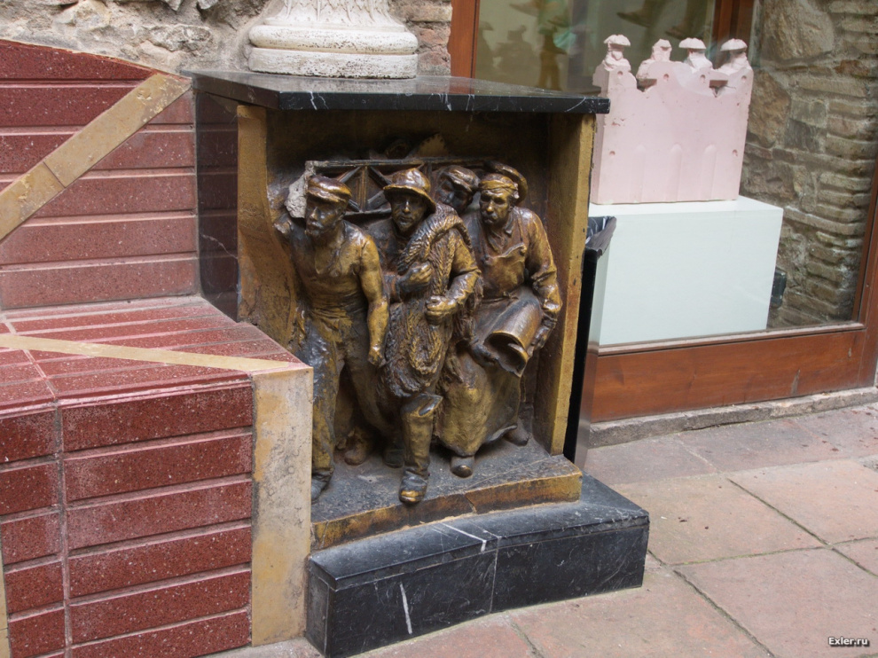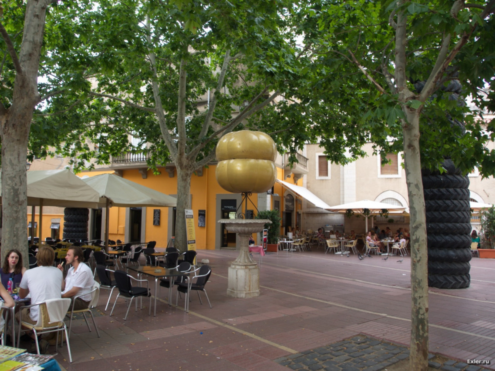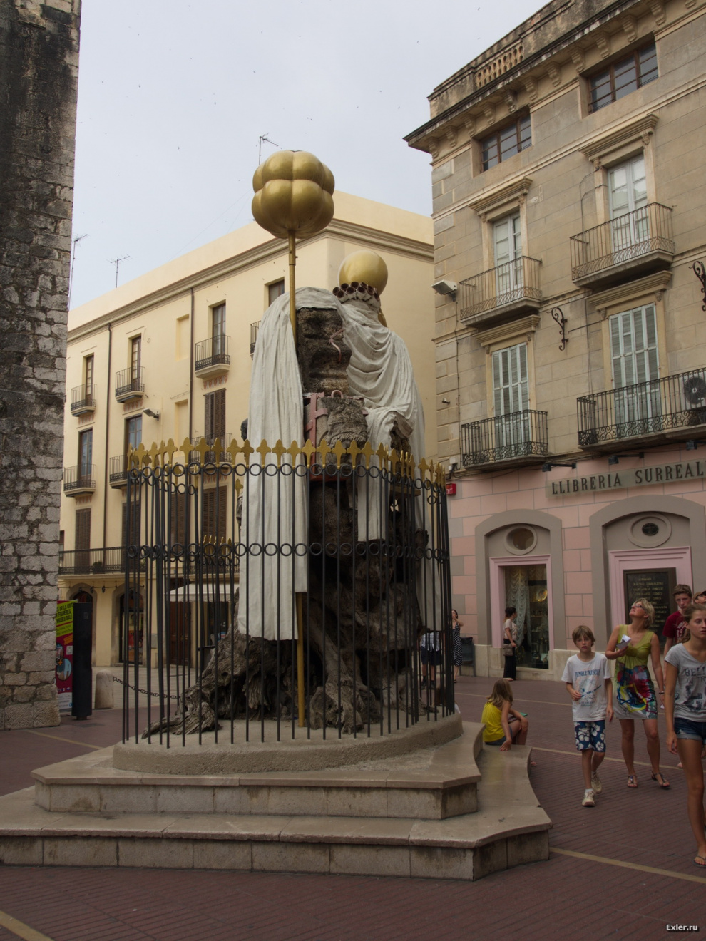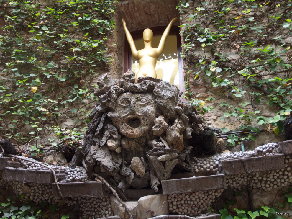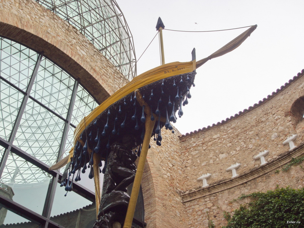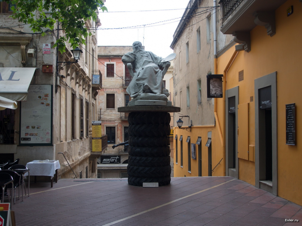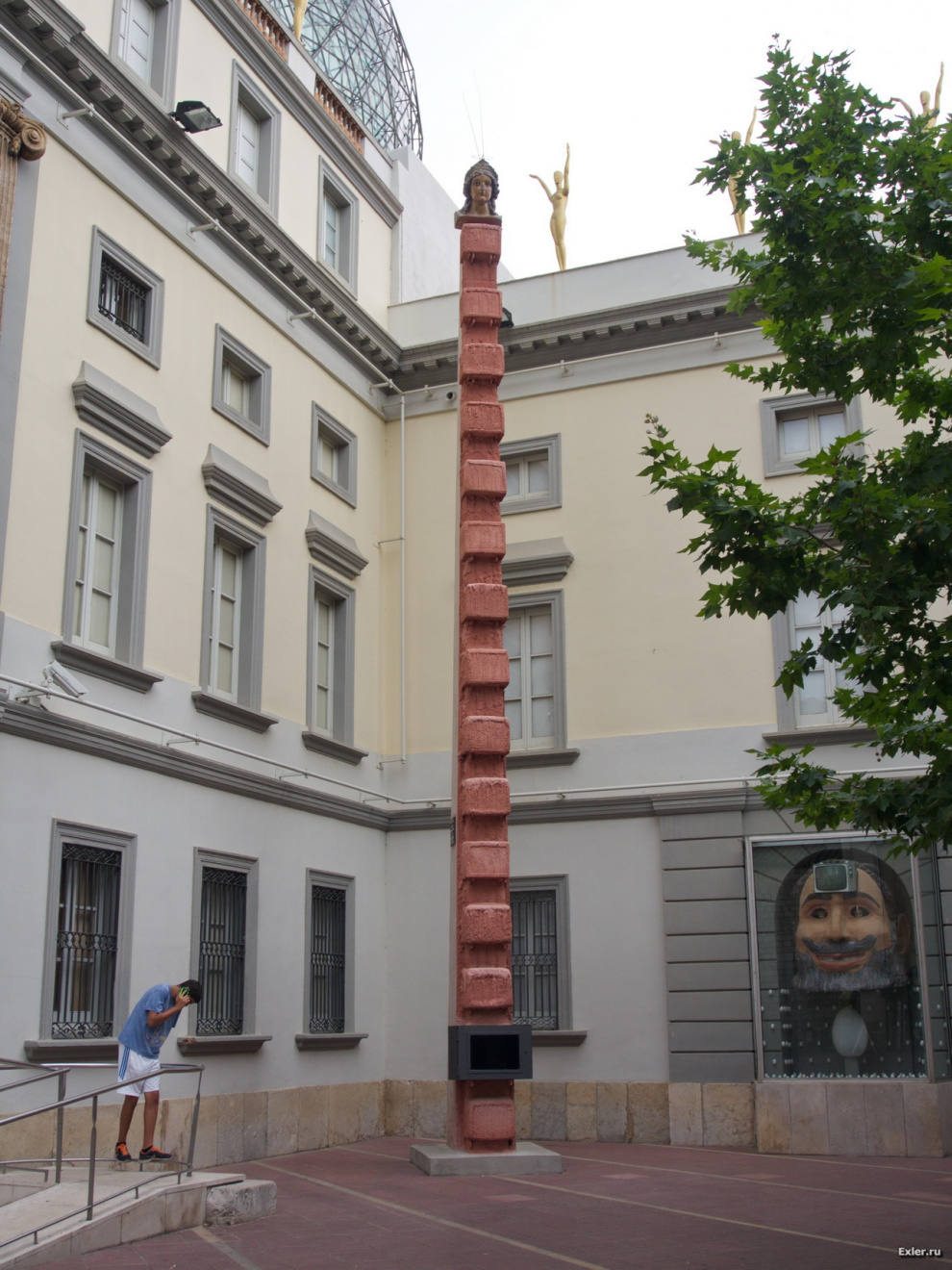 Обходим музей слева и идем ко входу. Во дворе - несколько ресторанчиков и всякие инсталляции. Тут аж три скульптуры, водруженные на башни из тракторных шин. Вот это - скульптура живописца Менсонье, которого очень почитал Дали.