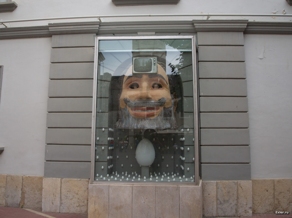 Экспозиция, вывернутая из музея наизнанку на улицу. Мужик с младенчиками в глазах, телевизором во лбу и обложенный яйцами. Дивное зрелище.