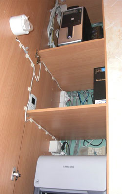 Простите... но отстой... было б это года 3 назад, то я бы тоже восторгался, но сейчас то чего? Шкафчик такой уже нафиг не нужен. От обычного телефона избавиться надо вместе с дект-станцией, вайфай роутер с принтсервером незаметно спрятать за шкаф, не далеко от принтера и NATa, остальные компы и буки по дому кормятся вайфаем, по нему же и айпителефония, по нему же кормить инетом неттоп за телеком, который в свою очередь будет кормить телек айпи-тв. Кроме этого телеки в доме можно завязать по DLNA тоже по вайфаю, но желательно по 300-мегабитному. И всё!!! Какие провода? Какой шкафчик с вентиляторами? Патефона там не хватает, 21-век уже 10 лет как.