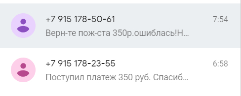 Относительно новая разновидность подобного развода - приходит в вайбер сообщение от абонента МТС или 900, текст сообщения совпадает со стандартной смс, которая приходит при зачислении денег. После этого уже приходит смс с просьбой вернуть деньги.