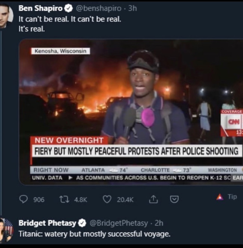 Тем временем семья Джейкоба Блейка, чей арест стал спусковым крючком для беспорядков, осудила погромы. Его мать сказала, что очень уважает Трампа и попросила его помочь восстановить сожженый дотла город после разгула “антифа”.
