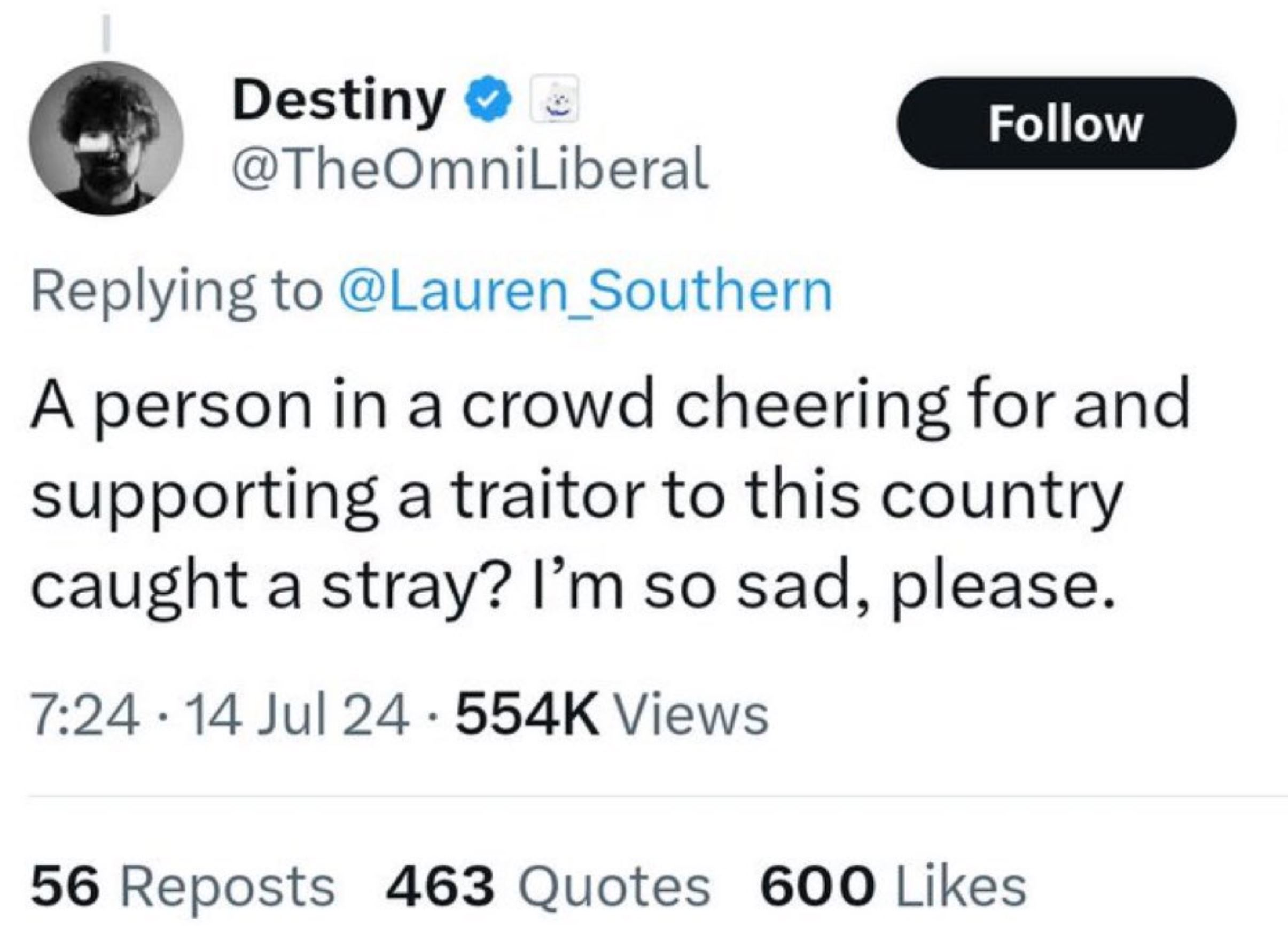 Некто Дестини, комментируя фото трибуны, залитой кровью одного из зрителей, закрывшего собой семью и погибшего от пули стрелка, пишет: "Все, что я вижу, это плюс один Байдену в Пенсильвании." И далее, на втором скриншоте: "Кто-то в толпе, поддерживающей и приветствующей предателя этой страны поймал случайную пулю? Ой, так грустно, я вас умоляю..."
