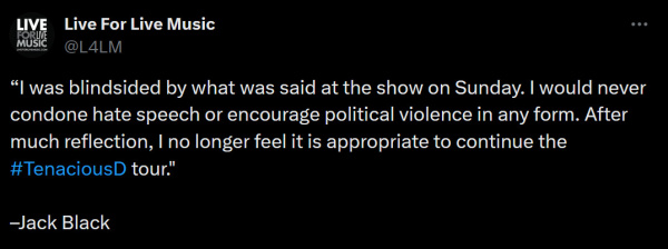 Я не нашел записи того, что происходило на концерте сразу после этого, однако к чести Блэка скажу, что он на следующий же день заявил в соцсетях: "Я был ошеломлен тем, что было сказано на шоу в воскресенье. Я никогда не потворствую разжиганию ненависти и не поощряю политическое насилие в любой форме. После долгих размышлений я больше не считаю целесообразным продолжать тур TenaciousD".