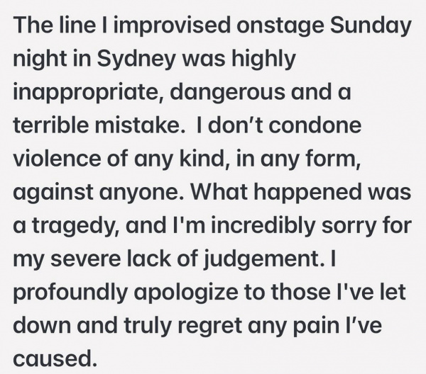 Кайл Гасс в своим Инстаграме принес извинения за эту дебильную шутку, написав: "Шутка, которую я сымпровизировал на сцене в воскресенье в Сиднее, была крайне неуместной, опасной и ужасной ошибкой. Я не одобряю насилие в любом виде, в любой форме, в отношении кого бы то ни было. То, что произошло, было трагедией, и я невероятно сожалею о том, что у меня не хватило рассудительности. Я приношу глубочайшие извинения тем, кого я подвел и искренне сожалею о боли, которую я
