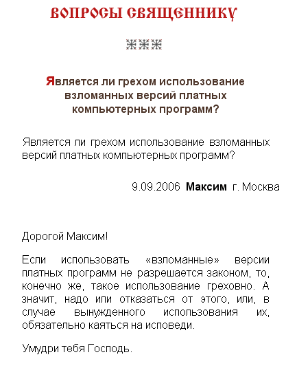 Мне кажется, зря ты так, Алекс (поместил сие для осмеивания). Во-первых, не смешно. Во-вторых, нормальный ответ священника, далекого от программирования, и руководствующегося обычными общечеловеческими ценностями.