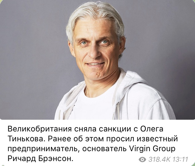 Тем временем, ВБ сняла санкции с Тинькова. Такой сигнальчик олигархам, - ребята, будете лояльными Западу, дадим морковку.