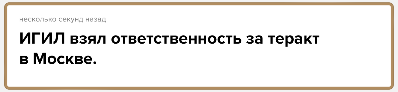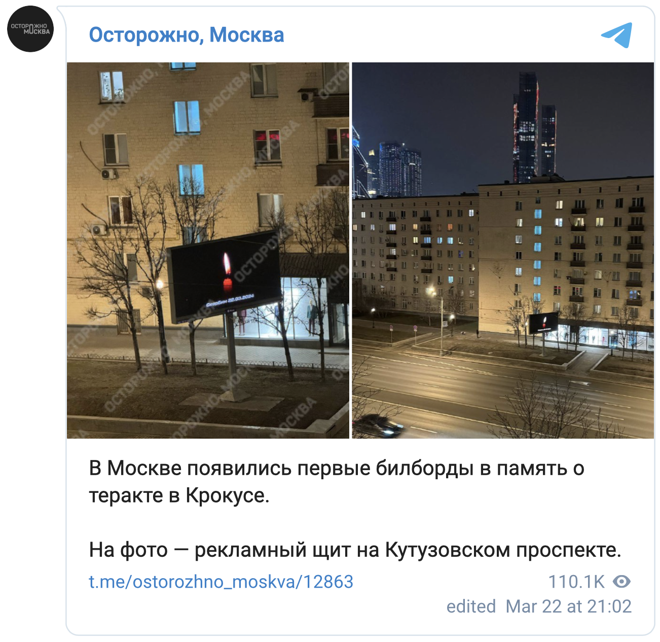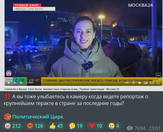"В программе «Время» на Первом канале, которая началась 13 минут назад, первой новостью стал теракт в «Крокус Сити Холле»."