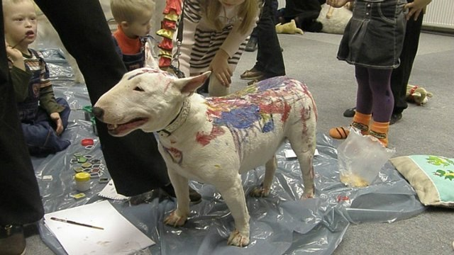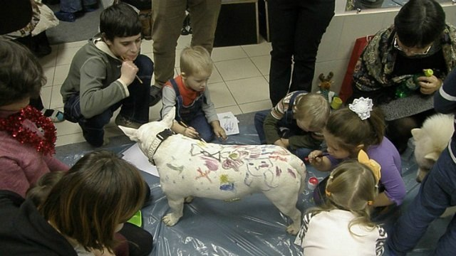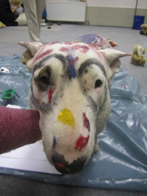 Если точно известно, что у буля вменяемые хозяева - ему очень даже можно доверять. Как мне когда-то объяснял профессиональный заводчик, нормально воспитанный бультерьер - это собака, которая обязана лежать и не дергаться, пока хозяин зашивает на нем раны. Что ему какие-то дети с гуашью.