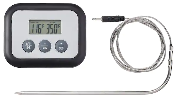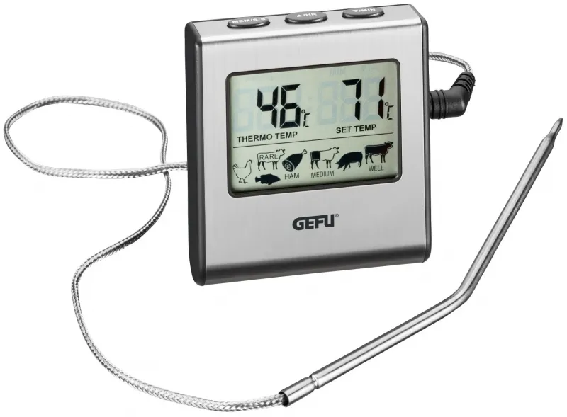 Пользуюсь термометром из ИКЕА за 500 руб. Он просто ТОП за такие деньги. Gefu Скала (сейчас продается за 3,5 тыс.) рядом не стоял. Термометр всего за пару секунд показывает текущую температуру, позволяет выставить целевую и при достижении начинает пищать. Купил несколько, пользуюсь и дома при готовке в духовке и для проверки готовности стейков на сковороде, также на даче при готовке на гриле.