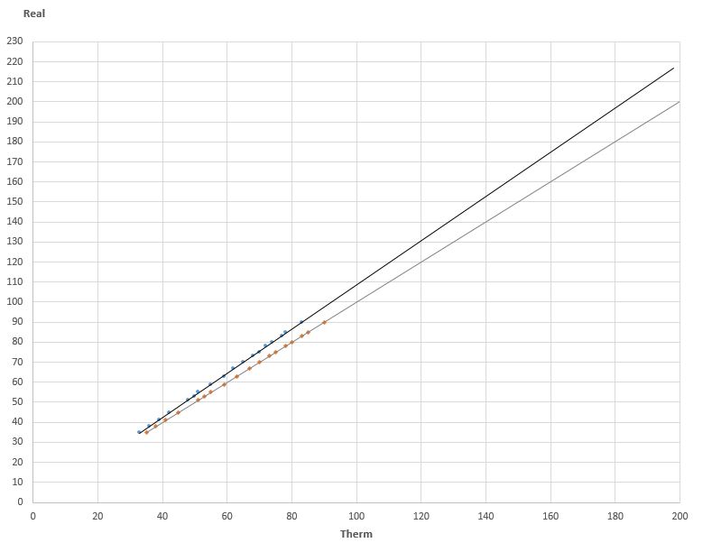 Удобный, но к сожалению, он врёт ( ну как бы неудивительно длё дещёвого китайского). Благо есть возможность сделать измерения и сравнить с реальными показаниями. Получилось, что чем выше температура, тем больше отклонение от реальной температуры. Но, по крайней мере, отклонение линейное, так что можно аппроксимировать и использовать для духовки. (оранжевые точки - как должно быть, синие - как есть на самом деле).