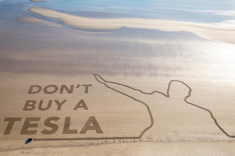 Прикольная история. Campaign group Led By Donkeys использовала автомобиль Tesla, чтобы начертать на пляже огромные слова "НЕ ПОКУПАЙТЕ TESLA", а также изображение Маска, отдающего "нацистский салют".
