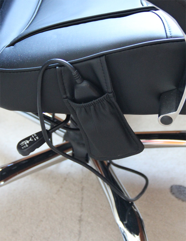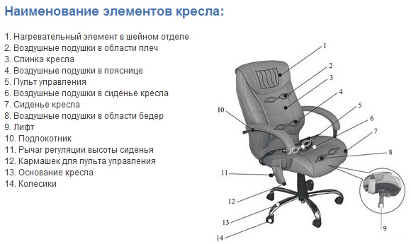 О том, что оно массажное, говорит специальное отделение под сиденьем кресла, а также пульт управления, который убирается в специальный футляр.