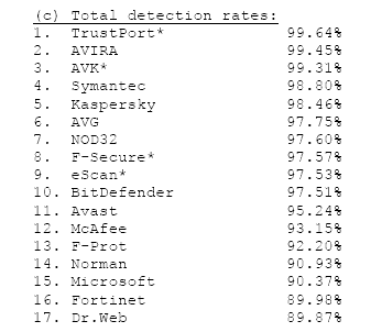 А теперь личный опыт: в конце прошлого года была атака - более сотни новых вирусов в течение месяца. TrendMicro'officeScan не брал (образцы отсылал им), но запасной сканер (only) DrWEB только 1 раз не признал, Каспер - более 15 пропустил (на тот момент). Вот их и уважаю. Хотя см.п. 1.2