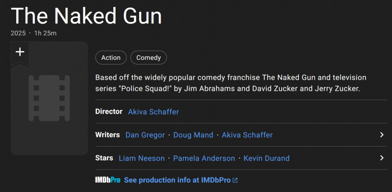 Нафига они все это затеяли - решительно непонятно. Ну разве что добавить к фильмографии Лиама Нисона очередное кинобарахло. У него последние фильмы - все как на подбор! Ну так и снимался бы во всяких "заложницах 15" и прочих боевых пенсионерах, зачем над классикой измываться? Тем более что Нисону типаж Фрэнка Дребина (он, правда, по фильму будет типа как Фрэнк Дребин-младший) не подходит совершенно.