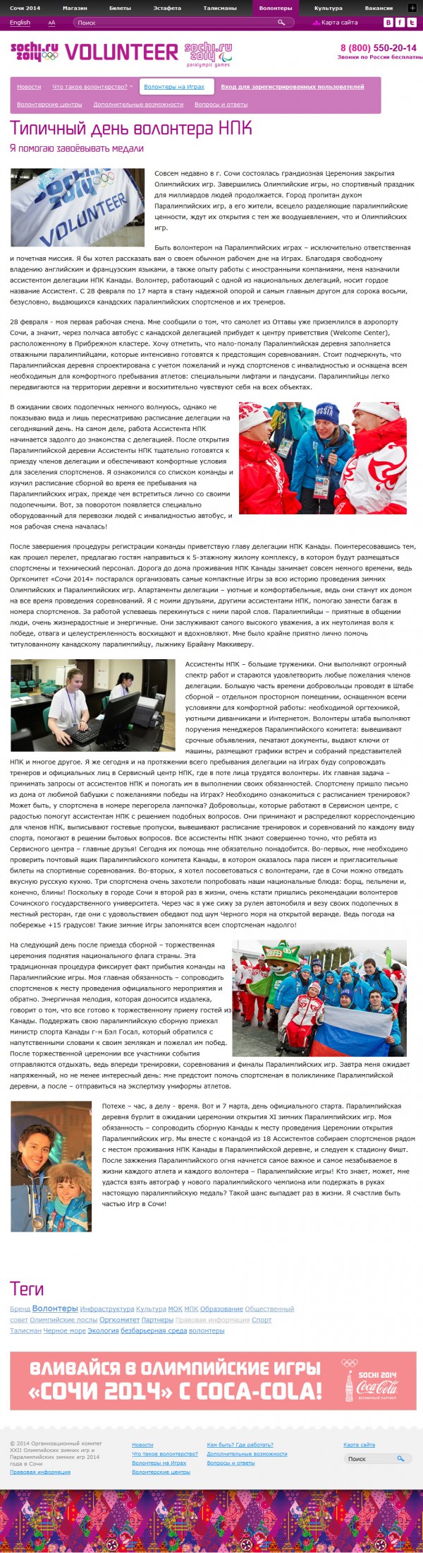 Милая статья, размещенная на официальном сайте волонтеров сочинской Олимпиады. На главной странице по причинам, которые будут понятны из текста ниже, ссылки на нее еще нет, статью можно прочитать только по прямой ссылке. (Upd: Оказалось, что ссылка с главной на нее есть: пункт меню "Волонтеры на Играх" и подменю "Типичный день волонтера НПК".)