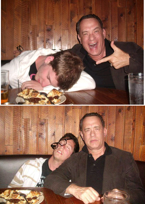Том Хэнкс не знает этого молодого человека на фото, впрочем как и сам юноша никогда лично не встречался с актером. Том обедал в одном из ресторанов, когда за соседним столиком увидел отключившегося парня и подсел к нему проверить все ли в порядке. Юноша не отозвался, зато Хэнкс вдоволь нафотографировался с ним на его же смартфон. (Отсюда.)