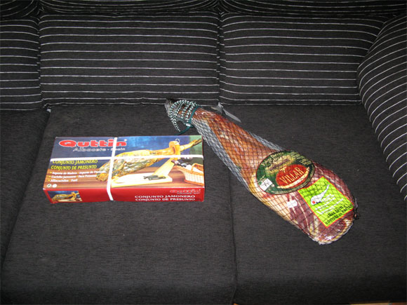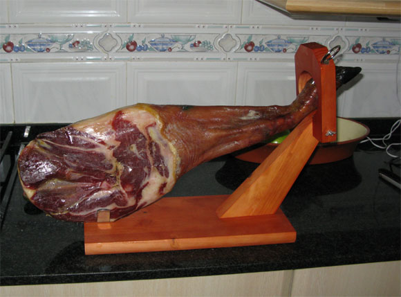 Ладно - купил хамон. Но надо же его как-то есть. Без специальных приспособлений не обойтись, потому что ножка увесистая, жирная, и просто так с ней не совладать. Кроме того, нужен еще специальный ножик - длинный и очень тонкий, чтобы срезать хамон тонюсенькими пластами.