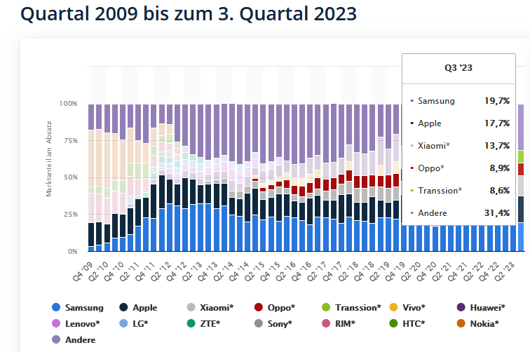 Интересен был бы еще один показатель: срок эксплуатации смартфона.Сдается мне что у iPhone он существенно больше чем у Samsung, а у Samsung существенно больше чем у китайских смартфонов. Если это так, то в общем то понятно что iPhone лидирует в продажах - это очень качественная и "долгоиграющая" техника.