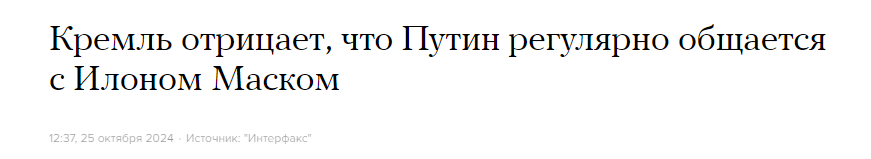 Контекст. В октябре 2022 года политолог Ян Бреммер в рассылке Eurasia Group написал (https://t.me/agentstvonews/1557), что Маск рассказал ему о разговоре с Путиным и условиях, на которых, по словам российского президента, возможны переговоры с Украиной. Сам миллиардер в 2023 году говорил, что общался с Путиным только один раз: они говорили о космосе в 2021 году.