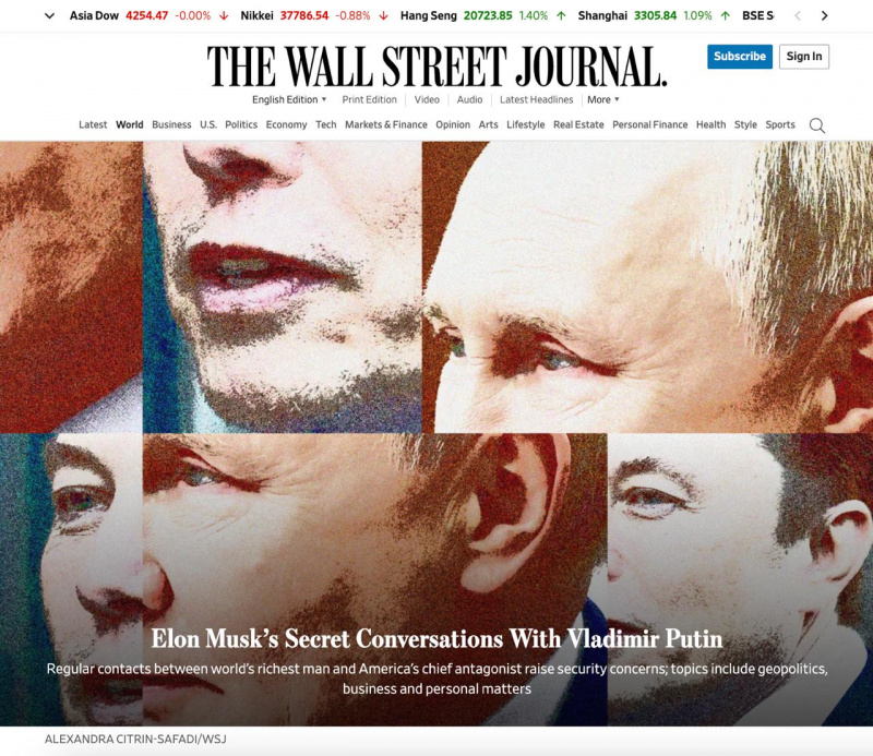 Ну, в общем, о постоянных контактах Маска с Путиным было известно и раньше, но тут всякие подробности в The Wall Street Journal, которые кратко изложило "Агентство".