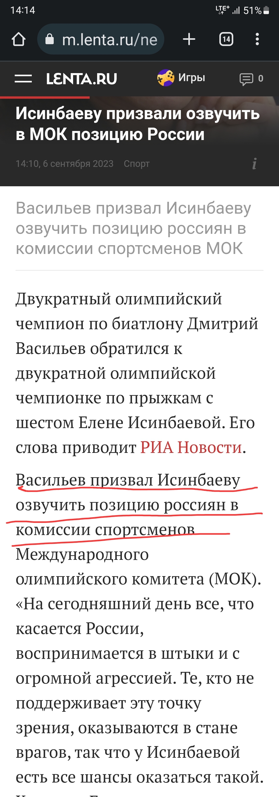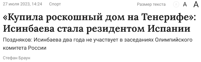 В МОК, в комиссии которого Исинбаева состояла с 2016 года, провели в отношении нее проверку, но комиссия выяснила, что товарищем майором Исинбаева была всего на полшишечки, что ее контракты с ВС РФ остались давно в прошлом, и что с 24 февраля 2022 Исинбаева не имела контрактных связей с российской армией и не поддерживала войну РФ в Украине (прим. Экслера - и это правда: никаких заявлений по поводу так называемой СВО Исинбаева не делала, и на постоянное место жительства в Испанию, судя по некоторым сведениям из испанской прессы, она уехала еще осенью 2021 года; впрочем, это никак не отменяет ее истории взаимоотношений с путинским режимом).