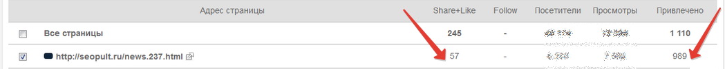 Рис. 04 – Детальная статистика, включающая количество share каждой страницы и сумму привлеченных пользователей благодаря этим share.