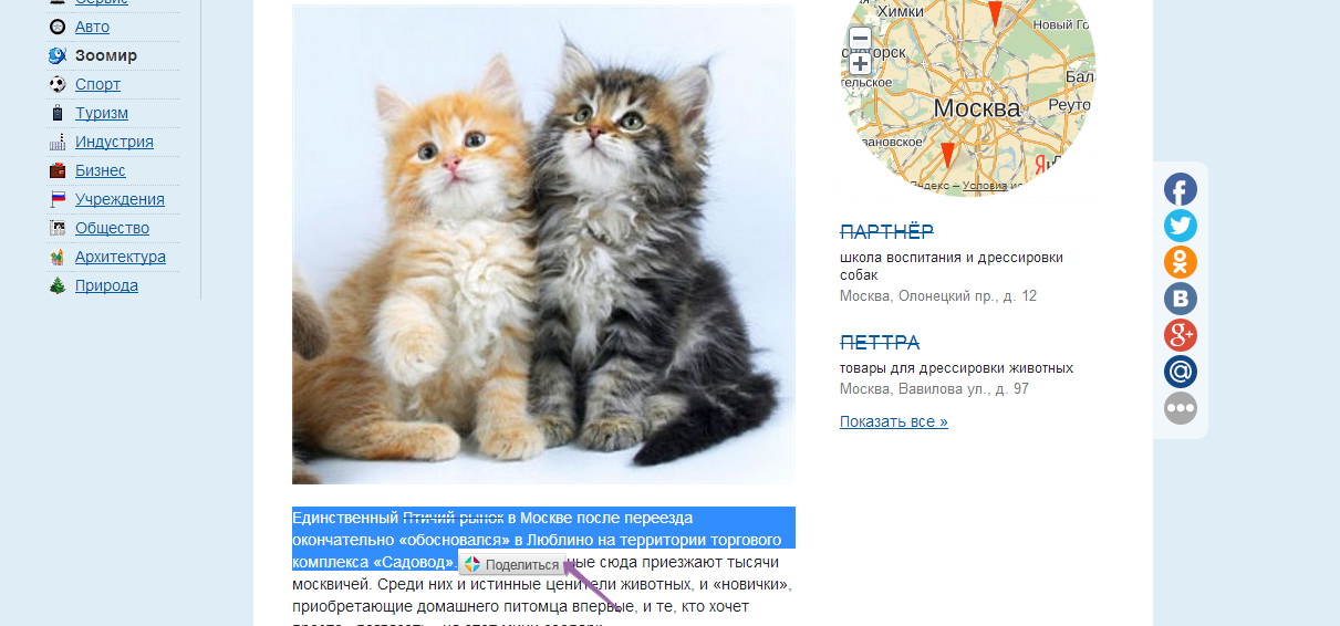 - Кстати ещё одна очень удобная опция расшаривания «для ленивых» пользователей есть у UpToLike – это цитирование по тексту: пользователь выделяет понравившеюся цитату в тексте, и именно эту цитату ему предлагается автоматически вставить в его пост на его странице в соцсети.