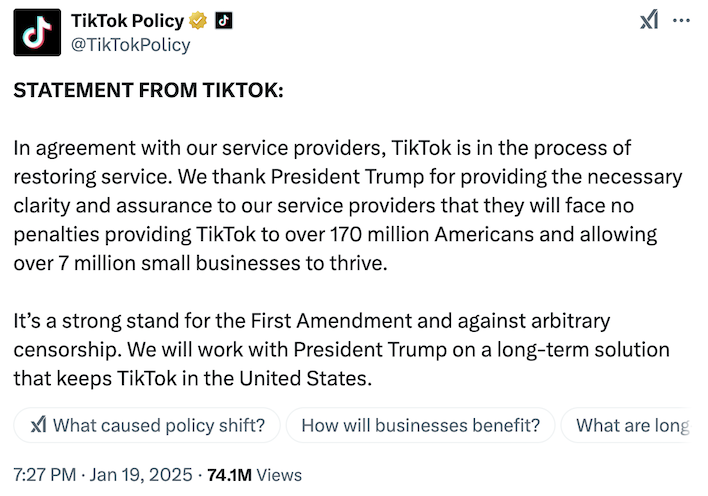 - Приказал федеральным органам не энфорсить запрет на ТикТок в течение 75 дней, чтобы за это время найти решение, которое предотвратит его закрытие в США