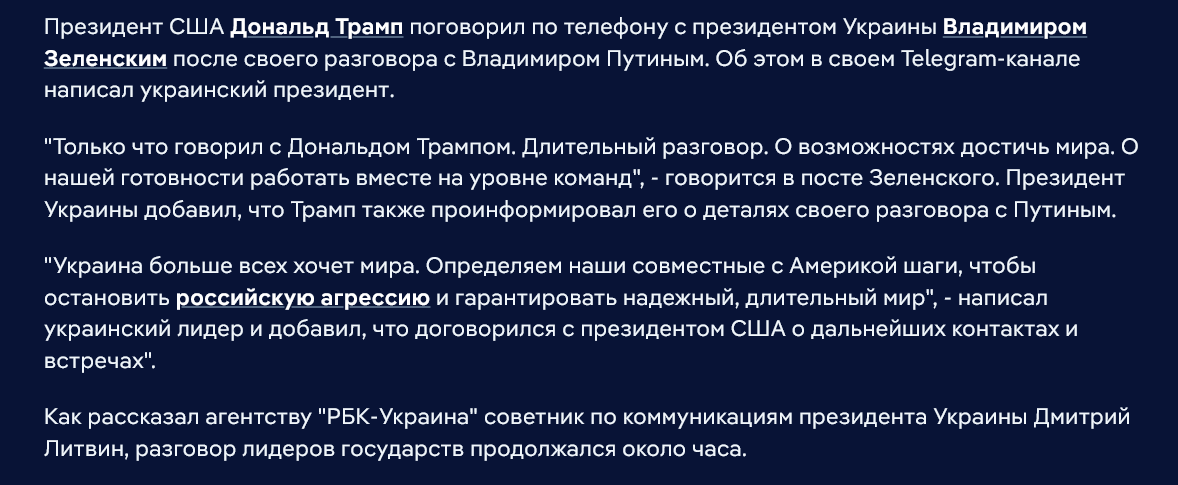 Я только что провел продолжительный и очень продуктивный телефонный разговор с президентом России Владимиром Путиным. Мы обсудили Украину, Ближний Восток, энергетику, искусственный интеллект, силу доллара и другие темы. Мы оба размышляли о великой истории наших народов и о том, что мы так успешно воевали вместе во Второй мировой войне, помня, что Россия потеряла десятки миллионов людей, а мы, в свою очередь, потеряли очень многих! Каждый из нас говорил о сильных сторонах наших наций и о том, какую пользу принесет нам совместная работа. Но сначала, как мы оба согласились, мы хотим остановить миллионы смертей, происходящих в войне между Россией и Украиной. Президент Путин даже использовал мой очень сильный девиз предвыборной кампании - «ЗДРАВЫЙ СМЫСЛ». Мы оба очень верим в это. Мы договорились работать вместе, очень тесно, включая посещение государств друг друга. Мы также договорились, что наши соответствующие команды начнут переговоры немедленно, и мы начнем с того, что позвоним президенту Украины Зеленскому, чтобы сообщить ему о состоявшемся разговоре, что я и сделаю прямо сейчас. Я попросил государственного секретаря Марко Рубио, директора ЦРУ Джона Рэтклиффа, советника по национальной безопасности Майкла Уолтца и посла и специального посланника Стива Виткоффа возглавить переговоры, которые, как я твердо уверен, будут успешными. Миллионы людей погибли в войне, которая не случилась бы, будь я президентом, но она случилась, и поэтому должна закончиться. Больше ни одна жизнь не должна быть потеряна! Я хочу поблагодарить президента Путина за его время и усилия в связи с этим призывом, а также за освобождение вчера Марка Фогеля, замечательного человека, которого я лично приветствовал вчера вечером в Белом доме. Я верю, что эти усилия приведут к успешному завершению, надеюсь, в ближайшее время!