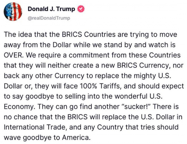 Трамп вдруг озаботился тем, что страны БРИКС типа как собираются ввести свою валюту для международной торговли. Болтовня об этом идет давно, но вообще введение подобного очень маловероятно - по многим причинам. Но Трамп вчера вдруг озаботился, и сказал, чтобы они там заканчивали разводить разговорчики в строю, а то сейчас сразу всем отвыкнет.