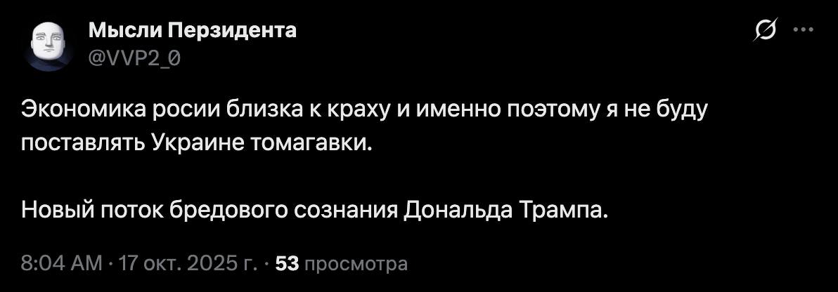 "Мнение" как мне кажется, никто не менял. П**деть не мешки ворочать, а в сухом остатке - при Трампе Украине от США помощи нет и не предвидится. При разговоре о Томагавках, уверен, все ожидали, что так и будет, вопро был лишь на каком этапе.