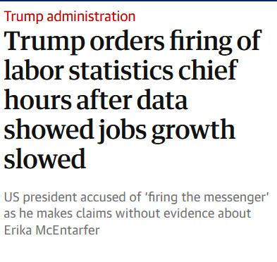 Действительно похоже на отвлечение внимания. Учитывая то, что Трамп уволил главу бюро трудовой статистики через несколько часов после публикации данных с очень низким числом новых рабочих мест по итогам месяца. Прямо заявив, что увольняет её из-за этих чисел, якобы она их сфабриковала.