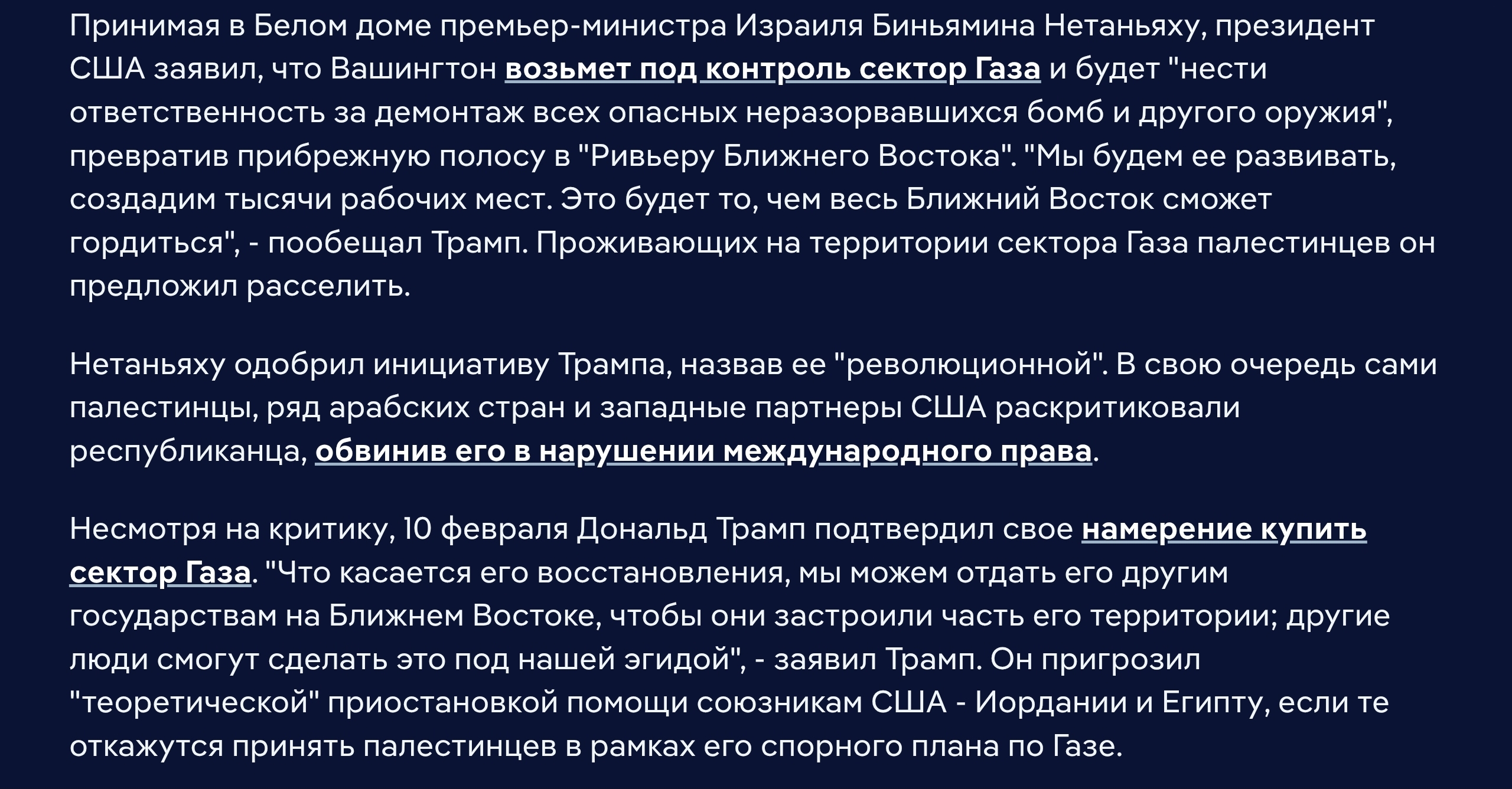 Проблема не в том, что кому-то нравится хамас или не хочется освобождения заложников. Проблема в у опичности всех идей трампа. Ну вот полтора миллиона человек расселить в другие арабские страны звучит обалденно. Только это значит, что в относительно дружных с Израилем арабских странах появятся ячейки хамас. А эти страны не то, что стабильны и процентов 50 населения Израиль не очень любит. Что может пойти не так?