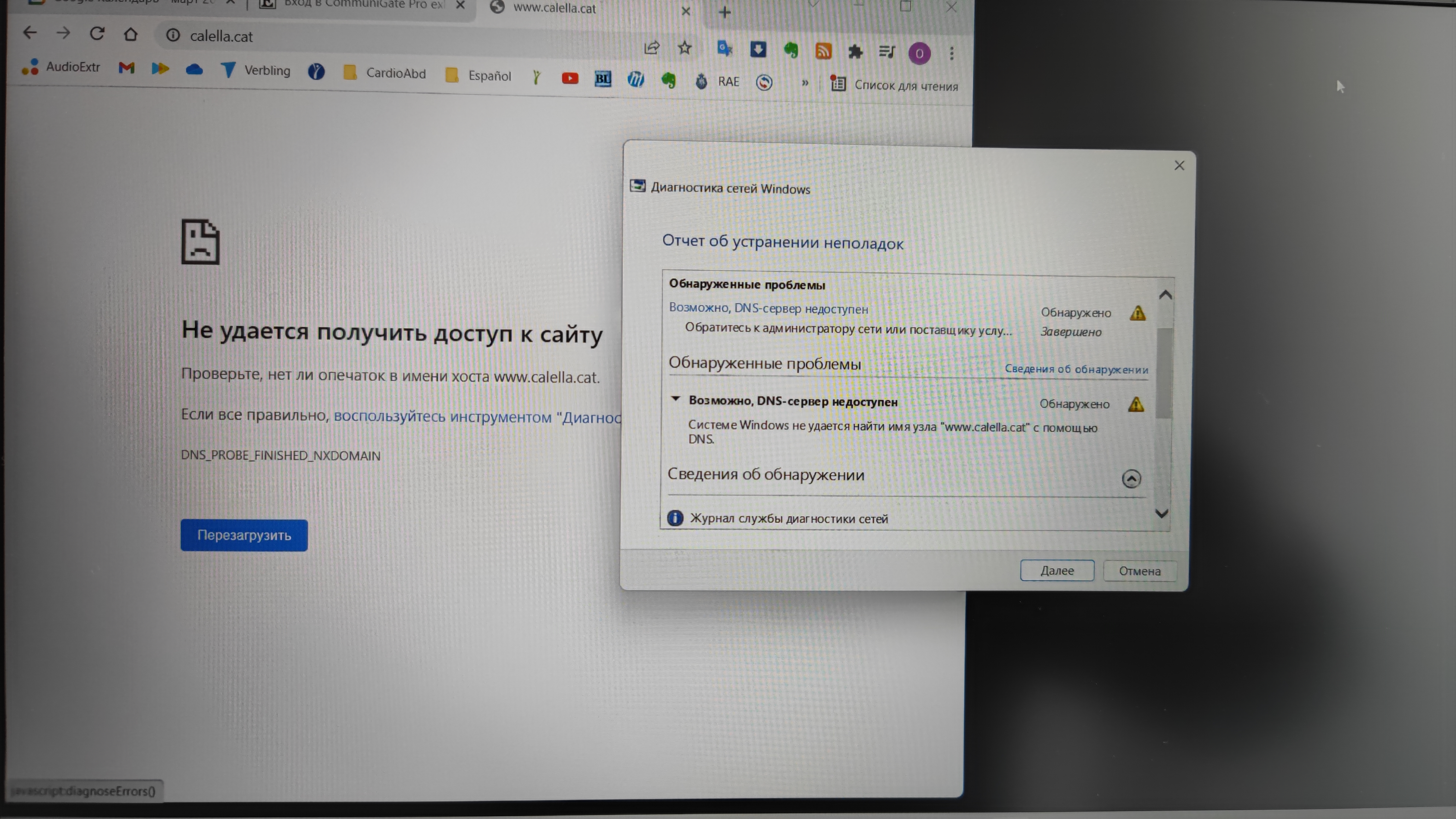 Симптомы следующие. Есть оптическое подключение к Интернету, есть домашняя локальная сеть и сеть Wi-Fi, построенная на кинетиках. На ноутбуке жены ни в какую не открываются некоторые сайты - ошибка соединения (два сайта мы обнаружили - calella.cat и life360.com). При запуске диагностики сети система пишет, что возможны проблемы с DNS.