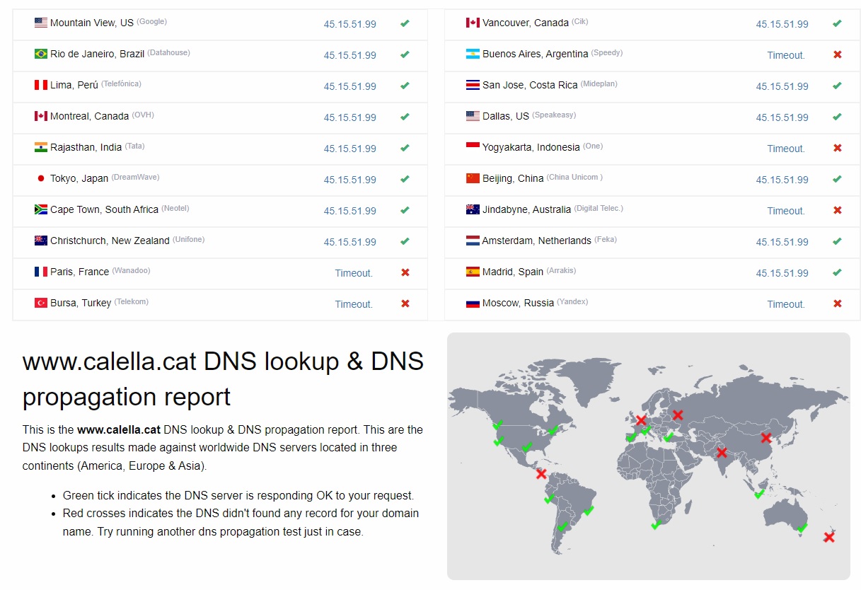 Позапускал www.calella.cat на dnspropagation.net, он фейлит в разных странах при каждом новом запуске. Вот, что было при первом. А потом Франция и Турция отзвались, NOK остались только Бразилия, Аргентина, Индонезия и Россия.
