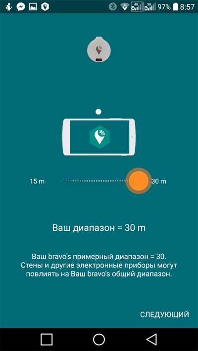 Подключается по Bluetooth, регистрируется в смартфоне. Смартфон типа как тестирует дальность, на которую может удаляться устройство (я уверен, что это совершенно фейковая операция) и далее выдает уверение в том, что наш диапазон - 30 метров. Да-да, конечно.