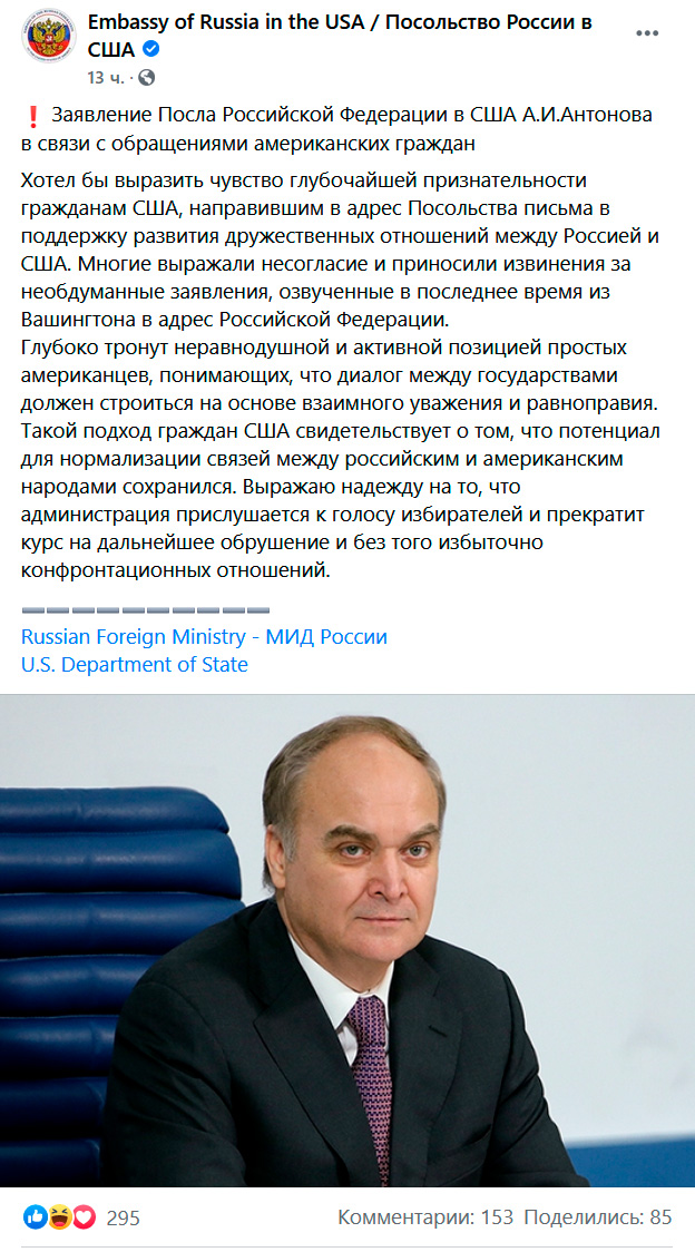 Третьи сутки простые американцы тоннами слали в адрес Посольства России в США письма с извинениями за необдуманные заявления Байдена и лично выражали надежду послу РФ в Вашингтоне Анатолию Антонову в том, что невероятно дружественные отношения между Россией и США будут и дальше развиваться.