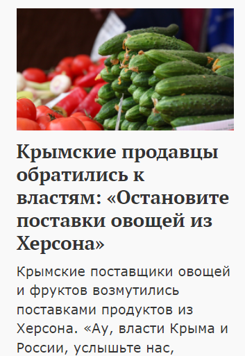 Крымские поставщики овощей и фруктов возмутились поставками продуктов из Херсона. «Ау, власти Крыма и России, услышьте нас, обычных работяг, которые своим трудом хотят заработать на жизнь выращиванием овощей и ягод, — обратился через соцсети местный предприниматель. —
