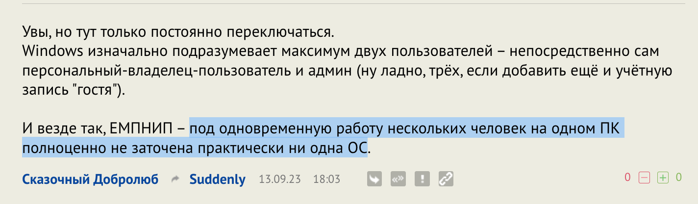 И везде так, ЕМПНИП – под одновременную работу нескольких человек на одном ПК полноценно не заточена практически ни одна ОС.